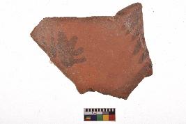 | Description / विवरण | Specimen of black on red ware with decorative geometric Sun and plant motif painting. |