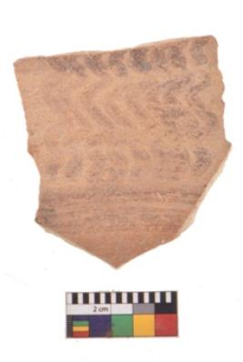 | Description / विवरण | A specimen of a potsherd. It is reddish in colour with black decorative geometric painting on it. |