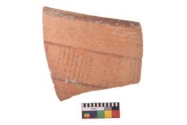 | Description / विवरण | A specimen of a potsherd. It is reddish in colour with black decorative geometric painting on it. |