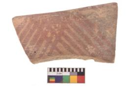 | Description / विवरण | A specimen of a potsherd. It is reddish in colour with black decorative geometric painting on it. |
