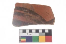 | Description / विवरण | Specimen of potsherd black on red painted pottery. It is fine fabric in sharp contrast with painted design are executed in black pigment. |