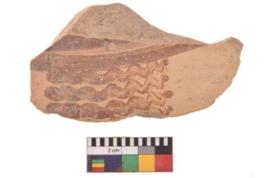 | Description / विवरण | A specimen of a potsherd. It is reddish in colour with black decorative geometric painting on it. |