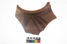 | Description / विवरण | Specimen of potsherd black on red painted pottery. It is fine fabric in sharp contrast with painted design are executed in black pigment. |