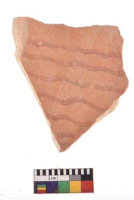 | Description / विवरण | A specimen of a potsherd. It is reddish in colour with black decorative geometric painting on it. |