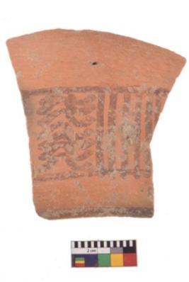 | Description / विवरण | A specimen of a potsherd. It is reddish in colour with black decorative geometric painting on it. |