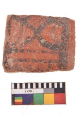 | Description / विवरण | A specimen of a potsherd. It is reddish in colour with black decorative geometric painting on it. |