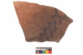 | Description / विवरण | Specimen of Potsherd black on red painted pottery. It is fine fabric in sharp contrast with painted design are executed in black pigment. |
