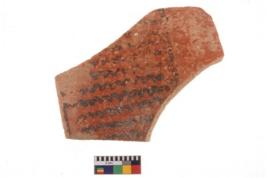| Description / विवरण | Specimen of potsherd with decorative geometric painting. Type Black on Red Ware . |