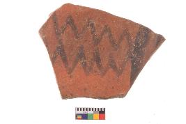 | Description / विवरण | Specimen of Potsherd black on red painted pottery. It is fine fabric in sharp contrast with painted design are executed in black pigment. |