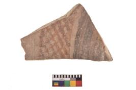 | Description / विवरण | A specimen of a potsherd. It is reddish in colour with black decorative geometric painting on it. |