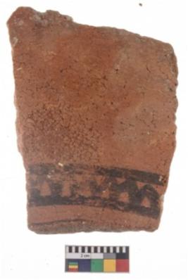 | Description / विवरण | Specimen of potsherd black on red painted pottery. It is fine fabric in sharp contrast with painted design are executed in black pigment. |