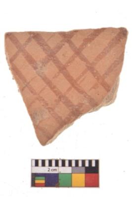 | Description / विवरण | A specimen of a potsherd. It is reddish in colour with black decorative geometric painting on it. |