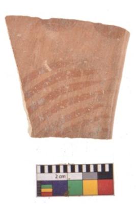 | Description / विवरण | A specimen of a potsherd. It is reddish in colour with black decorative geometric painting on it. |