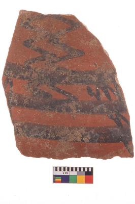 | Description / विवरण | Specimen of potsherd with black decorative geometric zigzag painting, Type Black on Red Ware . |