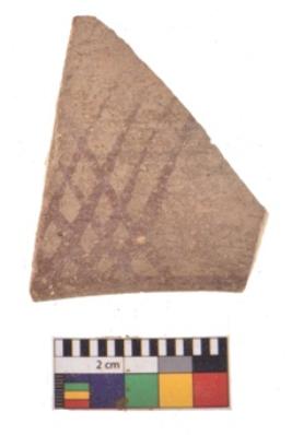 | Description / विवरण | A specimen of a potsherd. It is reddish in colour with black decorative geometric painting on it. |
