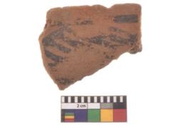 | Description / विवरण | Specimen of black on red ware with black decorative Lattice pattern geometric painting. |