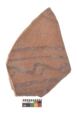 | Description / विवरण | Specimen of black on red ware with black decorative Parallel wavy and straight lines geometric painting. |