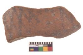 | Description / विवरण | Specimen of black on red ware with black decorative Lattice pattern geometric painting. |