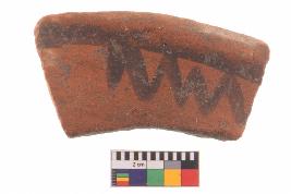 | Description / विवरण | Specimen of potsherd with black decorative zigzag painting, Type Black on Red Ware . |