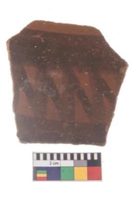 | Description / विवरण | Specimen of potsherd black on red painted pottery. It is fine fabric in sharp contrast with painted design are executed in black pigment. |