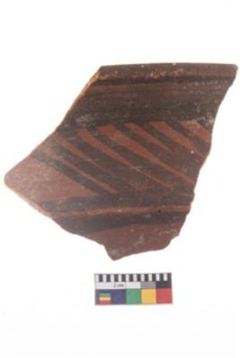 | Description / विवरण | Specimen of potsherd black on red painted pottery. It is fine fabric in sharp contrast with painted design are executed in black pigment. |