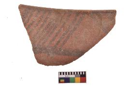 | Description / विवरण | Specimen of black on red ware with decorative geometric Groups of oblique strokes set in horizontal bands on the exterior painting. |