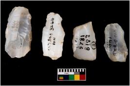 | Description / विवरण | Specimen of a fluted cores with several broad fluted marks indicating the detached blades from it. Some of them are tapering at one end. |