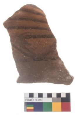| Description / विवरण | Specimen of potsherd black on red painted pottery. It is fine fabric in sharp contrast with painted design are executed in black pigment. |