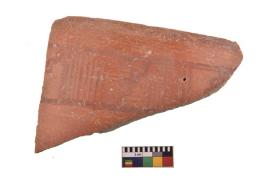 | Description / विवरण | Specimen of red on red ware with decorative geometric A groups of vertical lines set in horizontal bands and cross latticed bands painting. |