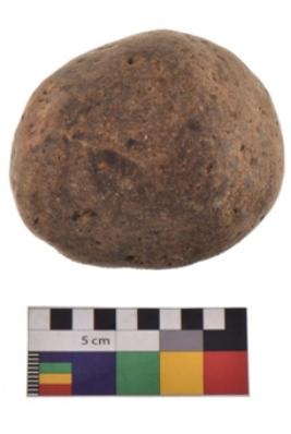 | Description / विवरण | Specimen of a round hammerstone with battered periphery along with the circumference. |