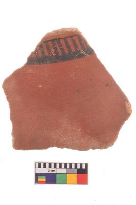 | Description / विवरण | Specimen of potsherd with black decorative geometric Linear painting, Type Black on Red Ware . |