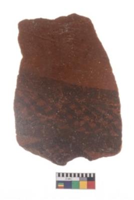 | Description / विवरण | Specimen of potsherd black on red painted pottery. It is fine fabric in sharp contrast with painted design are executed in black pigment. |