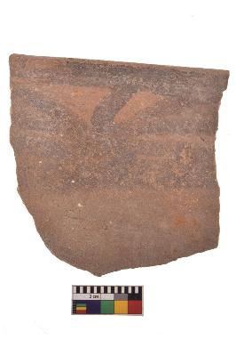 | Description / विवरण | Specimen of black on red ware with decorative geometric Its decorated with two horizontal bands with sets of triple arches painting. |