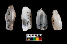 | Description / विवरण | Specimen of a fluted cores with several broad fluted marks indicating the detached blades from it. Some of them are tapering at one end. |