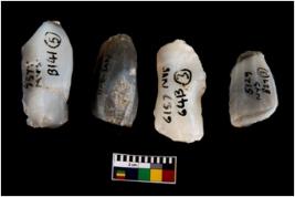 | Description / विवरण | Specimen of a fluted cores with several broad fluted marks indicating the detached blades from it. Some of them are tapering at one end. |