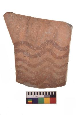 | Description / विवरण | Specimen of red on red ware with decorative geometric Wave design painting. |