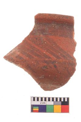 | Description / विवरण | Specimen of potsherd with black decorative geometric Linear painting, Type Black on Red Ware . |
