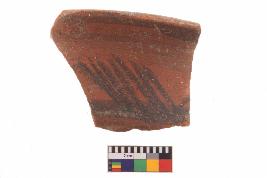 | Description / विवरण | Specimen of potsherd with black decorative geometric Linear painting, Type Black on Red Ware . |