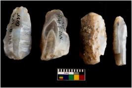 | Description / विवरण | Specimen of a fluted cores with several broad fluted marks indicating the detached blades from it. Some of them are tapering at one end. |