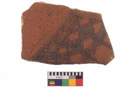 | Description / विवरण | Specimen of potsherd with black decorative geometric Diamond set broad horizontal bands painting, Type Black on Red Ware . |