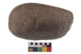 | Description / विवरण | Specimen of an uneven grinding stone. It has battered surface along with curved ridges. |