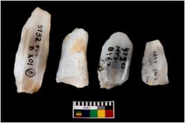 | Description / विवरण | Specimen of a fluted cores with several broad fluted marks indicating the detached blades from it. Some of them are tapering at one end. |