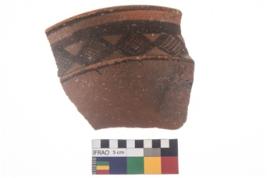 | Description / विवरण | Specimen of potsherd with black decorative geometric diamond set broad horizontal bands painting . |