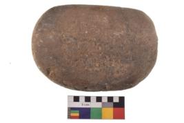 | Description / विवरण | Specimen of a grinding stone. It has battered surface along with curved ridges. |