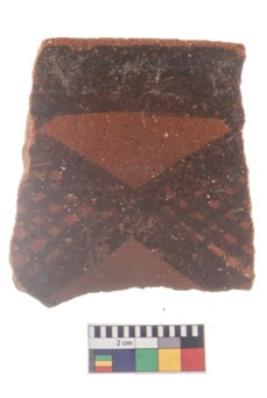 | Description / विवरण | Specimen of potsherd with black decorative geometric diamond set broad horizontal bands painting . |