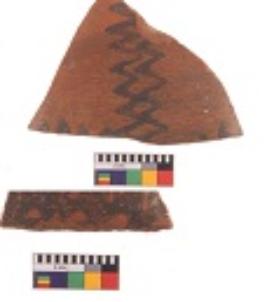 | Description / विवरण | Specimen of potsherd with black decorative zigzag painting, Type Black on Red Ware . |
