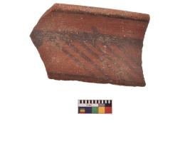 | Description / विवरण | Specimen of black on red ware with decorative geometric Groups of oblique strokes set in horizontal bands on the exterior painting. |