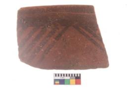 | Description / विवरण | Specimen of potsherd black on red painted pottery. It is fine fabric in sharp contrast with painted design are executed in black pigment. |