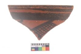 | Description / विवरण | Specimen of potsherd with black decorative geometric diamond set broad horizontal bands painting. |