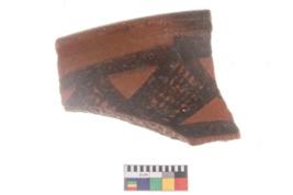 | Description / विवरण | Specimen of potsherd with black decorative geometric diamond set broad horizontal bands painting. |